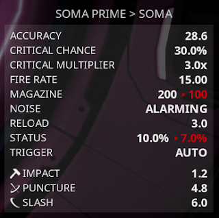 Obviously, the Soma Prime should be built for crit. 30%/3x is one of the best set of crit stats in the game, and helps to compensate for the measly base Damage. A Status Chance of 10% is not great, but somewhat compensated for by such a high RoF.With a RoF of 15/s, Mag Capacity of 200 and a Reload Time of 3sec, the SomaP has a very respectable Reload Ratio of 4.44. However, with such a high ROF, it goes through its magazine and 800 spare ammo surprisingly quickly.