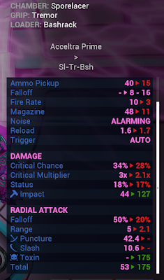 A Primary Sporelacer can be built into a relatively fast-firing, AoE weapon. As a Kitgun, its Crit/Status spread can be adjusted with different Loaders, however the AcceltraP will always have better Crit. As in this example Tremor-Bashrack build, the AcceltraP's Crit/Status spread is always going to be better, as is its explosive radius. As such, I don't think a Primary Sporelacer really offers much over the AcceltraP.